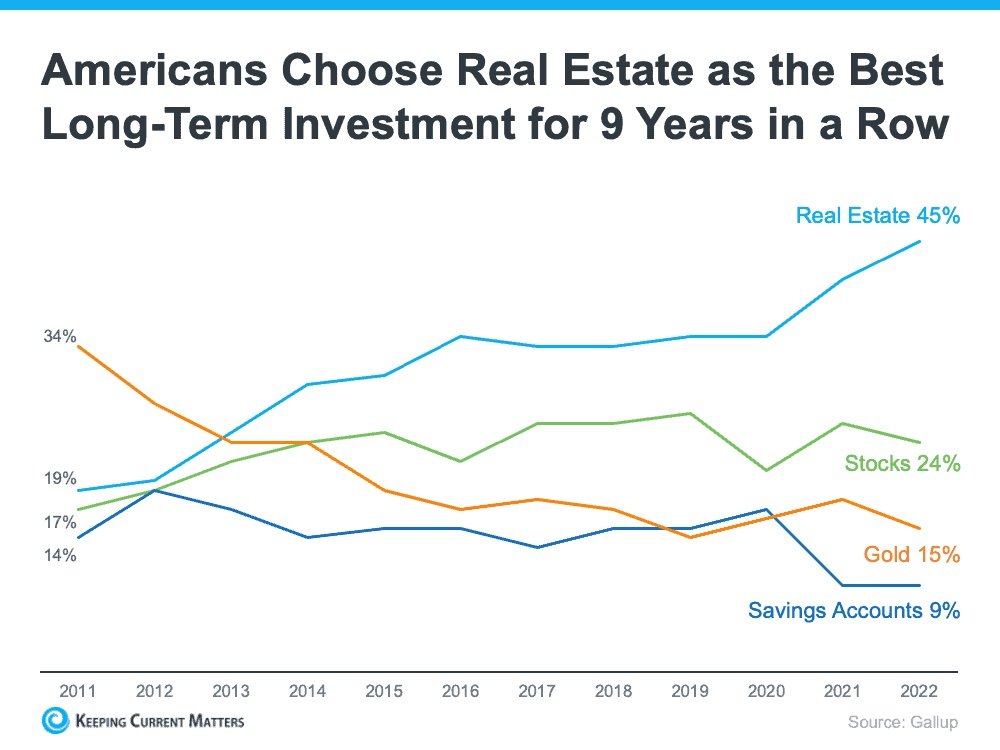 Americans’ opinion on the value of real estate as an investment is climbing. That’s according to an annual survey from Gallup. Not only is real estate viewed as the best investment for the ninth year in a row, but more Americans selected it than ever before.